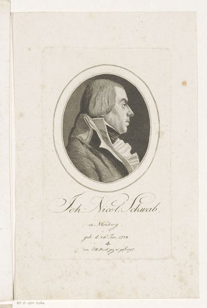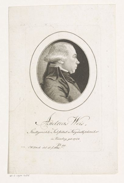 Editor: Here we have Christoph-Wilhelm Bock's 1797 engraving, "Portrait of Andreas Tobias Pröschel," housed in the Rijksmuseum. It’s rendered in that lovely, precise old engraving style. I find his profile quite striking... almost austere. What do you see in this piece? Curator: This portrait speaks volumes about the socio-political climate of the late 18th century. Consider Neoclassicism's deliberate revival of classical aesthetics. It wasn’t merely about art; it was a conscious effort to link back to perceived republican virtues. Doesn’t Pröschel’s rather stiff posture and severe expression read almost like a rejection of aristocratic frivolity? How does this image engage with Enlightenment ideals of reason and civic duty, in your opinion? Editor: I suppose so. It’s certainly less showy than earlier portraits of wealthy people. The plain oval frame also makes it seem simple and... unpretentious, perhaps? I didn’t really consider the political meaning. Curator: Exactly. Engravings like this were widely distributed, playing a significant role in shaping public perception. Consider also, the limitations placed upon artists in this time period. Who did they choose to represent, and what choices were they constrained by? What is missing from this history and why? Editor: It’s like a form of visual propaganda, in a way. It is a statement, consciously framing its subject according to a specific ideological framework. I had not thought of this from this kind of sociological perspective before. Thanks. Curator: Absolutely. It underscores the interconnectedness of art, power, and representation. Keep questioning what and WHO is being shown and why!