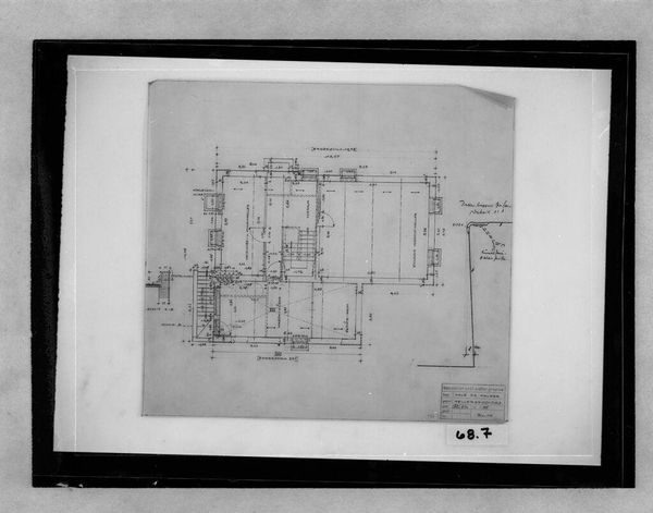 Editor: This is "Office and Factory Buildings, Cali, Colombia, 1945" by S.H. It's a foundation plan, quite technical. What strikes me is how much hand-drawing is involved. What do you make of it? Curator: As a materialist, I see the physical labor embedded in this plan. Consider the materials used: the paper, ink, the drafting tools themselves. This drawing represents the genesis of a building, but it's also a product of specific resources, a local economy, and an individual's skill. How does understanding the means of its production change your perspective? Editor: I hadn't thought about it that way. It makes me wonder about the availability of materials in Cali at that time. Thanks for the insight! Curator: Likewise, it is always useful to reconsider our understanding of the built environment from the perspective of the means of its production.