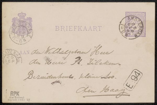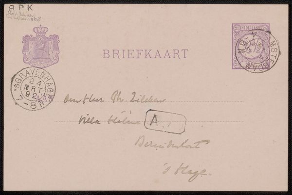 Wijnand Bastiaan van Horssen sent this briefkaart to Philip Zilcken in 1892. In its time, the humble postcard was not just a means of communication but a reflection of a society undergoing rapid change. Consider the act of corresponding itself. How did one’s class, gender, or access to literacy influence the ability to participate in such a seemingly simple act? The briefkaart becomes more than just a piece of mail; it’s a document hinting at social networks. Zilcken is identified as "Kunsschilder," or Artist, locating him in the cultural milieu of The Hague at the time. The stamps and postmarks on the card are material markers of Dutch identity and state infrastructure. These elements speak to the rise of nationalism and bureaucratic systems. The card invites us to consider the role of art and artists within this historical context.