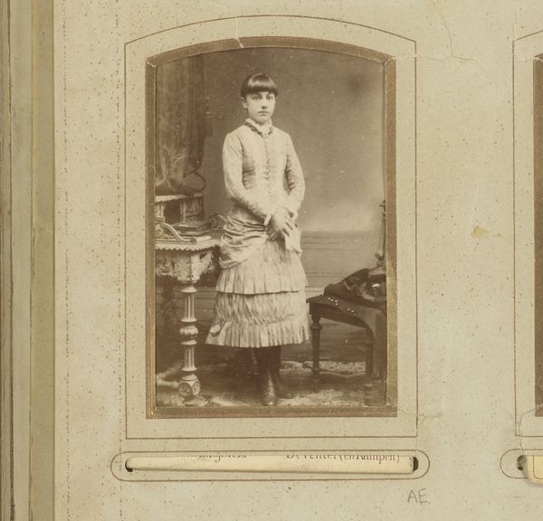 Curator: This is "Portret van een vrouw met hoed, staand bij een stoel," or "Portrait of a Woman with Hat, Standing by a Chair," attributed to Atélier Siewers, dating roughly from 1880 to 1920. It’s a photographic piece. Editor: It has a stark formality, doesn't it? A composition so studied and controlled, down to the precise tilt of her head. You sense the deliberate posing and the stillness demanded by the photographic process. Curator: Indeed. Considering its photographic origins, the tones are muted. The gradation creates depth and focus, particularly around her face, drawing the viewer’s attention. And the composition clearly segments foreground, middle ground, and background via carefully arranged layers. Editor: But I'm wondering about the hat—that incredible hat, with its feathery adornments. Think about the labor, the materials: feathers meticulously arranged, the fabric expertly shaped. The societal expectation, too. Curator: A striking detail that certainly adds texture. Let us analyze further: the sharp lines of her dress create angular shapes; however, her posture brings forth a fluidity that cuts through any tension. The photograph itself achieves its purpose; a successful capture of a modern, elegant lady of the period. Editor: The making of this photograph also relied on so much; the chemicals used for development, the particular glass plate negative—a complex and skilled industrial process helped her portray such an idealized view. The chair seems purposefully crafted too—what story would the joinery have to tell? Curator: You raise intriguing points, however this piece is about conveying an idea of grace. Let us consider the geometry. We must account for negative space: the figure interacts with her environs to show how her fashion and accessories coalesce. Editor: Certainly, a successful interplay to indicate her class. It does make you think, who was she, and what was the atelier like that took such a meticulous shot. I also wonder at the circumstances surrounding this captured moment; the historical labor that enables and confines it. Curator: Fascinating to consider how varying approaches offer different insights into such artwork. Editor: It certainly gives the past new weight!