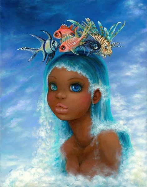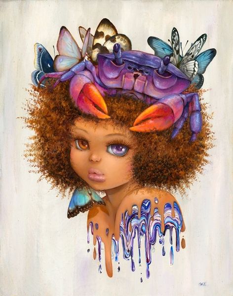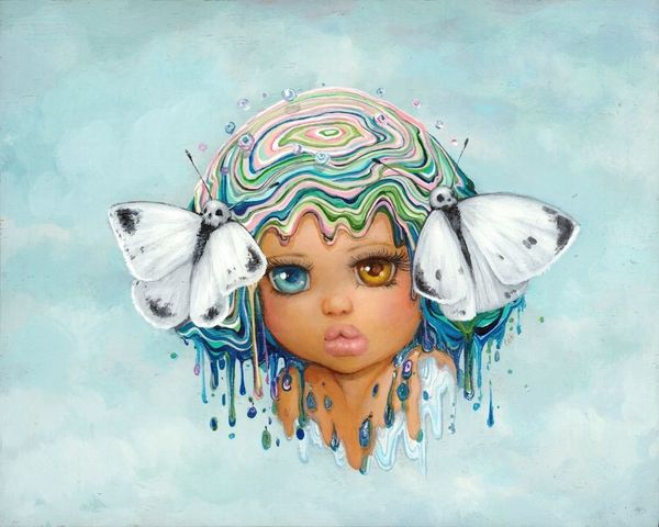 Curator: "Little Miss Goo" is a 2018 acrylic painting by Camilla d'Errico. It's quite an evocative piece, merging elements of portraiture with pop-surrealism. Editor: Wow. My first thought? A daydream caught on canvas. It’s so whimsical, so dripping with—literally dripping with—imagination. That little dragon perched on her head, those huge, innocent eyes… It’s like looking into a puddle of a child's thoughts. Curator: The fusion of realism with surreal elements is definitely striking. We see a hyper-realistic, almost doll-like figure, juxtaposed against this fantastical creature, what you called a dragon. These themes tap into some serious commentary regarding representation and innocence in contemporary media. Editor: "Representation and innocence," yes, totally. But also...doesn't it also remind you of the goo-covered toys that kids collect? Like she's wearing her own treasured, albeit slightly messy, imagination? There's a delicious irony here. This character seems to revel in what some might consider imperfection. Curator: Absolutely, there's a rejection of conventional perfection. The "goo," as it were, and those dripping colors become integral, even defiant parts of her beauty. It really challenges the artifice often associated with beauty standards in portraiture, especially of young girls. D’Errico, I would argue, actively undermines those standards. Editor: Exactly! It’s as if she’s saying, "Here’s beauty, but with a twist.” I mean, just look at the color palette – those dreamy blues and pastel pinks are like a lullaby. There is almost something melancholy lurking just beneath the surface. The glossy surface makes the "goo" look strangely desirable. Curator: You touch on something essential: desire. "Little Miss Goo" perhaps, embodies a broader, culturally ingrained desire for innocence and fantasy, but within an almost hyper-commodifiable context. The subject's race cannot be overlooked, either; what narratives does this create around contemporary expectations? Editor: Mmm. This is definitely one that lingers, even makes you smile. Thanks, d'Errico! Curator: Indeed. An excellent showcase for those wishing to understand contemporary figuration beyond a Eurocentric narrative.