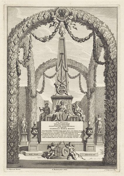 Curator: Before us, we have Jan Goeree’s engraving from around 1700, “Allegory on the Marriage of Abraham Lestevenon and Geertrui de Vroede,” currently held at the Rijksmuseum. Editor: It has a distinct sense of layered reality; the composition and detail in the etching demand slow observation, revealing the narrative by degrees. Curator: The engraving commemorates a specific union but operates within the established visual language of Dutch allegory, a cultural context steeped in symbolism related to social status. Think about the positioning of the families via the coat of arms and then, of course, the visual encoding of fertility and piety. Editor: Structurally, the monument creates a separation, bisecting the lower terrestrial level with the celestial cloudscape above, which directs the eye towards the family heraldry. The eye reads vertically; bottom to top, earth to heaven, the corporeal ascending into the spiritual realm. Curator: Considering the historical moment, we need to place this piece within Amsterdam’s burgeoning merchant class—people consolidating their positions via marriages such as this. It makes one consider the extent to which economic motivations were celebrated and given artistic life in such a fashion. What we see reflected here are notions of power, the patriarchy, and the very concept of status crystallized into a material form that reinforces very rigid, societal roles. Editor: True. However, what I find striking is Goeree's use of light and shadow to direct our focus—almost like spotlights—revealing the figures engaged in their symbolic roles. These choices emphasize specific narratives and moral judgments embedded within the composition itself. Curator: Indeed. When we consider this piece, we have to grapple with the reality that the artwork simultaneously served a personal and societal purpose, and operated within a historical framework still struggling with basic issues of equality. It's essential to engage with that intersectional analysis in an effort to understand both the overt message and its underlying implications. Editor: Absolutely, it presents a structured vision, where each symbolic choice speaks to societal norms and power structures. Thank you. Curator: A lens through which we might better appreciate and then critically assess this historical encoding of gender, race, class and power.