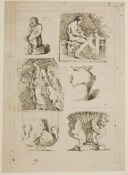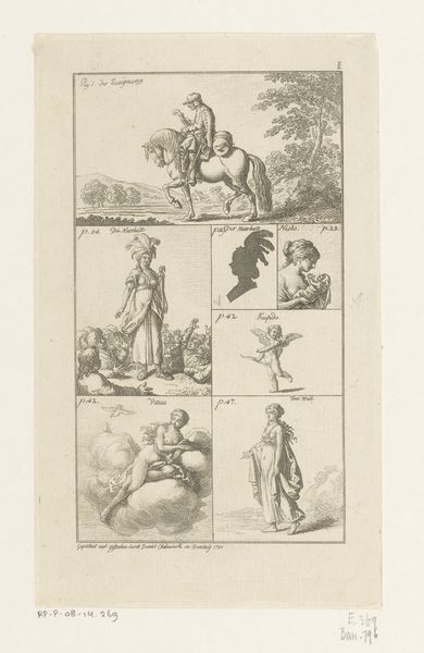 Editor: This print, "Erasmus, Praise of Folly" by Daniel Chodowiecki, seems to be a collection of symbolic vignettes. The whole piece feels rather enigmatic to me. What symbols stand out to you in this work? Curator: I see a layering of classical and contemporary symbols. Notice how Folly, the woman with the feathered hat, is celebrated by commoners. Above, a man rides with a fool on his horse, signifying folly guides even the powerful. Does this suggest anything about society's embrace of foolishness? Editor: It makes me wonder if the artist is celebrating or critiquing that embrace. Curator: Precisely! The winged Cupid and Venus amongst other allegorical figures hint at folly’s diverse forms, perhaps even self-deception. Does this change your initial impression? Editor: Yes, I see the complexity now. Thanks, this has been insightful!