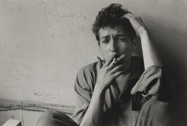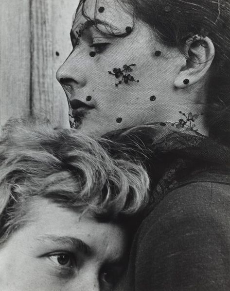 Curator: We're looking at an untitled black and white photograph by Garry Winogrand, taken in 1955. Immediately, one notes how he captures an intimate moment between a young couple. Editor: It feels… caught, doesn't it? Like we’re glimpsing a scene we weren’t supposed to see. The harshness of the light makes it feel almost like an interrogation. Curator: I agree. Considering the 1950s context, the image sparks conversations about gender roles, expected social scripts and postwar anxiety in America. Winogrand consistently disrupted those narratives. Look at how close he stands; he violates personal space with his lens. Editor: Totally! I mean, the pattern on that pillar next to them almost becomes a third character, claustrophobic and watching. Are they at a bus stop? A train station? The everyday feels strangely heightened and theatrical here. It even resembles some of the earliest portraiture from the mid 19th century, like those of Mathew Brady, but somehow feels much more immediate. Curator: Precisely! This piece challenges traditional representation. Winogrand captured raw moments in public spaces, unveiling the undercurrents of daily life that reflect broader societal tension. You can almost feel their ambivalence about societal expectations in that moment, trapped as they seem. Editor: It's interesting, too, that we have only a sliver of her face. He, the male figure, is put on display. It's this weird vulnerability paired with, like, the opposite, you know? And even the girl looking away could be representative of women in the 50's avoiding, like, direct confrontation, you know. Very symbolic! It looks almost voyeuristic as hell! Curator: Absolutely. Winogrand’s work forces us to confront uncomfortable truths about our gaze and assumptions within interpersonal dynamics. His photographic approach challenges and pushes back against typical 1950's family and interpersonal gender dynamics. Editor: Right. Well, that went in a pretty deep direction, didn't it? I think now, though, it has me questioning how different our modern age actually is to then in that regard! Curator: Perhaps, but it is clear we have not evolved as much as we like to think we have. An incredible artwork like this reminds us of our current moment by looking to the past.