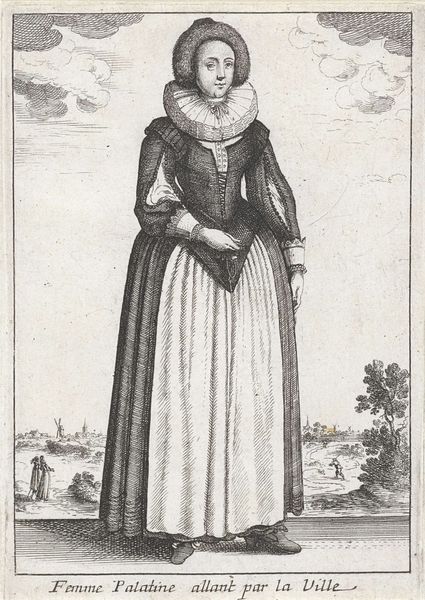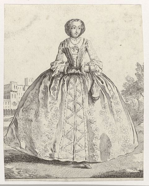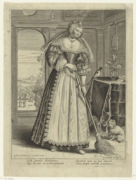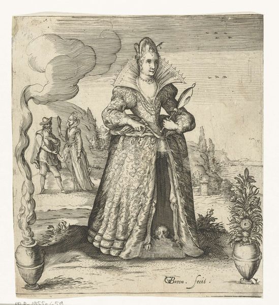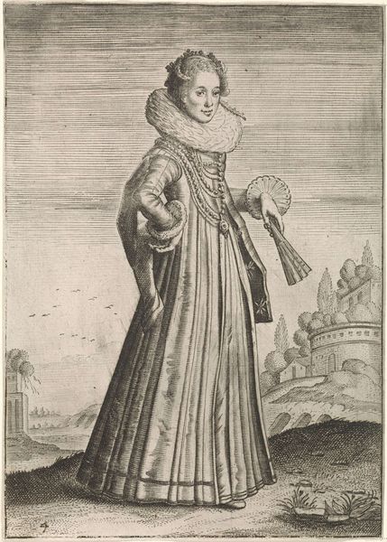 Curator: This is "Woman with Fan and Basket of Flowers," a print created between 1627 and 1629 by Theodor Matham. Editor: The first thing that strikes me is how incredibly detailed this engraving is. The pattern on her dress, the individual tiles, even the distant buildings--all meticulously rendered. You can almost feel the paper it's printed on. Curator: Matham, active during the Baroque period, utilized engraving to produce intricate details. Look at the flowers—each blossom appears distinct. The bouquet, beyond simple adornment, would likely have symbolized particular virtues or affiliations. Editor: Right, these weren't just decorative choices. Consider the cost of clothing like this at the time. The material labor needed to weave that fabric, not to mention the creation of the print itself. Someone carefully etched those lines into a plate. This was luxury, craft, and image all intertwined. Curator: Absolutely. And beyond just depicting finery, portraiture itself was often commissioned to portray a family's wealth, status, virtue or power. She stands between these pillars like an embodiment of Dutch domestic ideals. Editor: And that placement suggests the complex world of trade and status, too. She is almost contained within architecture; an individual is caught between material wealth, external presentation, and inner self. Curator: It brings into sharp focus the ways social standing was carefully cultivated and broadcast. It certainly prompts reflection about the endurance of these systems throughout our cultural timeline. Editor: This engraving beautifully captures a fleeting moment. And prompts one to ponder on what hasn't changed with regard to labour and materials. Curator: Precisely, and in a curious turn, it has spurred an awareness of historical echo through symbolism. Editor: For me, it amplifies what this painstaking work reveals regarding craftsmanship.