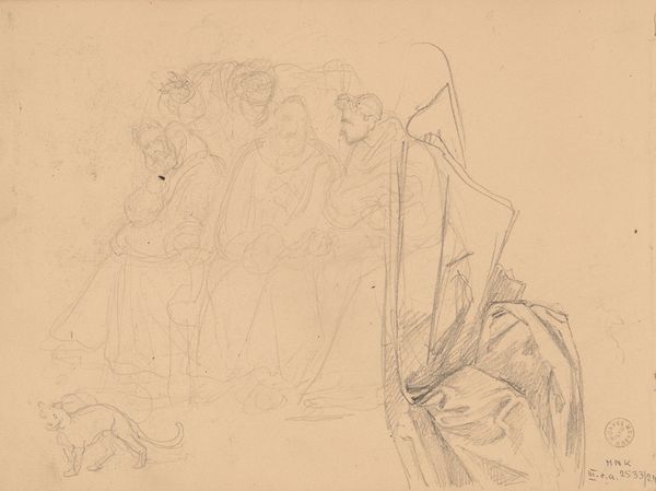 James Ensor created this drawing, "Mythological Scene," sometime around 1922, using graphite on paper. The scene is rendered with delicate, almost ghostly lines, creating a sense of ethereal and unreal quality. Ensor's composition is divided into distinct registers. At the top, ambiguous figures emerge from swirling lines, perhaps representing gods or mythical beings in the heavens. Below, we see two figures in the foreground, their faces close, evoking intimacy and introspection. The lines are used economically, yet they convey a sense of volume and emotional depth. The drawing’s power comes from the contrast between the defined figures and the abstract, energetic marks surrounding them. This interplay challenges fixed meanings, inviting us to contemplate themes of mythology, humanity, and the liminal space between the tangible and the imaginary. Ensor uses these formal qualities to not only depict a scene but also to engage with broader philosophical ideas about existence and representation.