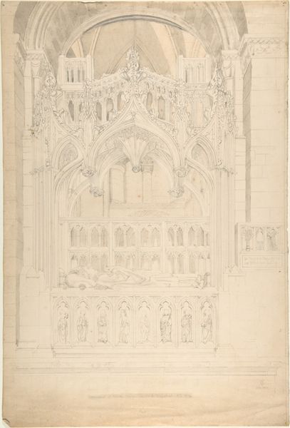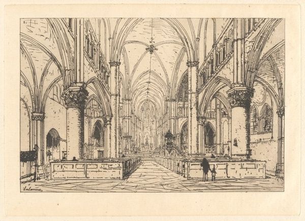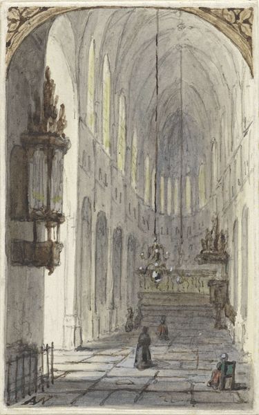 Curator: This watercolor on paper, held in the Tate Collections, captures Lichfield Cathedral's interior as seen from the organ, rendered by Sir Francis Chantrey. Editor: The immediate feeling is one of immense scale, yet also of lightness, almost ethereal. The arches reaching to the heavens definitely inspire awe. Curator: Cathedrals are full of that architectural symbolism, designed to inspire and connect humanity to the divine, with soaring heights and intricate details directing the eye—and thus the spirit—upward. Editor: Indeed, the ribbed vaulting almost feels like a skeletal structure. One could see the cathedral itself as a symbol of the body of Christ. Curator: And the light filtering through the windows... light as a symbol of divine revelation. Chantrey really captured this sacred space's emotional weight. Editor: It is a powerful reminder of how architecture can shape collective memory and reinforce cultural narratives. Curator: It gives one pause to consider how a single building can carry so much significance across time and culture.