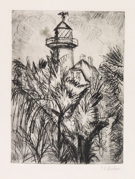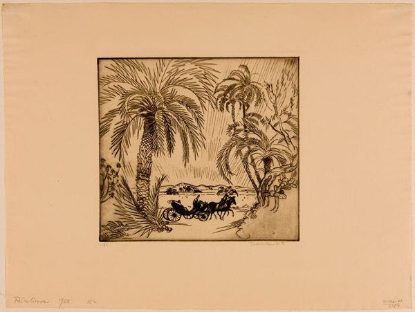 Curator: This is William H. Drury's print, "Trade Winds," housed here at the Harvard Art Museums. It immediately evokes a feeling of movement to me. Editor: Indeed. The composition, with its dynamic lines and etched textures, really captures the force of nature. Note how Drury uses hatching to give depth. Curator: The bending palm trees definitely represent resilience, but there's also a sense of vulnerability, wouldn't you say? Palm trees have long symbolized peace, yet they're shown here struggling against the wind's power. Editor: Symbolism aside, observe Drury's careful arrangement of light and shadow to amplify the dramatic intensity. He does not romanticize the scene; it feels raw and immediate. Curator: And, perhaps, reflective of the unpredictable nature of both life and the sea. It's fascinating how such a seemingly simple scene can hold so many layers of meaning. Editor: Agreed. Studying the image closely, one finds a study in how to effectively convey a powerful theme using minimal elements. It's a lesson in economy of expression.