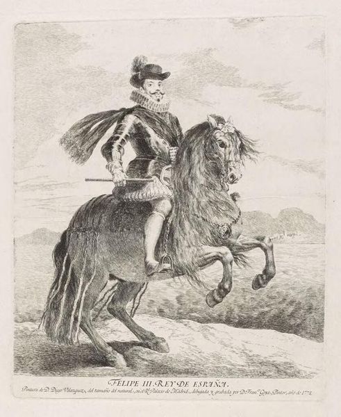 Curator: Goya's etching, "Baltasar Carlos, Prince of Spain," captures the young royal mounted on a rearing horse, a vision of youthful power. Editor: It strikes me as quite theatrical. The pose, the billowing clouds—it’s all staged to convey authority, but it feels almost… fragile. Curator: The dynamism is certainly intentional, playing with light and shadow to emphasize movement. The composition, anchored by the horse's powerful form, directs our gaze upward. Editor: I wonder, though, if Goya's intention was to merely glorify the prince? The subtle details—a hint of melancholy in the boy's expression, perhaps—suggest a more complex reading. It’s as if he's acknowledging the weight of destiny, even as a child. Curator: Indeed, Goya's genius lies in layering meaning. He was a master of visual rhetoric, able to imbue a portrait with both grandeur and introspection. Editor: Well, regardless, it's a rather remarkable capturing of a loaded moment. Curator: Agreed. The drama is just so compelling.