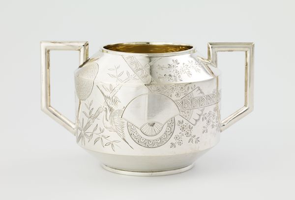 Editor: Here we have a silver sugar bowl, probably from the 1940s, here at the Minneapolis Institute of Art. It's quite striking with those delicate, etched scenes of boats and palm trees. There’s even some text in Arabic. What do you see in this piece? Curator: This sugar bowl, while seemingly decorative, speaks volumes about the intertwined histories of colonialism, trade, and representation. Consider that sugar itself fueled the transatlantic slave trade. This seemingly innocuous object becomes a vessel carrying complex narratives of exploitation. Editor: So the sugar bowl isn’t just about a picturesque scene? Curator: Absolutely not. The landscape imagery, the silver, and even the Arabic script—all need deconstruction. How does this idyllic image on the bowl, likely mass-produced, relate to the lived realities of those in the depicted locations? What labor produced the sugar it once held? These decorative arts are always so much more. Editor: That's a lot to unpack! It makes you think about where the silver came from too, and who mined it. Curator: Exactly. Objects like these were often designed for a specific market, catering to certain perceptions of “exotic” locales. Think about the orientalist tendencies prevalent during the mid-20th century. What ideas about Arab culture, about island life, are being reinforced, or perhaps created? Editor: I see. So, this isn't just a pretty piece of silverware, but a representation of a complex, unequal relationship. Curator: Precisely. The sugar bowl transforms into a poignant artifact, a silent witness to power dynamics embedded within seemingly harmless consumer goods. This lens encourages us to question whose stories are told, and whose are erased, in these artistic representations. Editor: That gives me a lot to think about. I’ll definitely look at decorative arts differently from now on. Thanks!