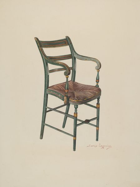This is Ralph Morton's Settee, a drawing made with graphite and watercolor. Isn’t it amazing how a simple subject, like a chair, can become a whole world? The way Morton renders the wood grain, it's almost like a topographical map, full of subtle shifts in tone. Look at how he uses watercolor to give the impression of light filtering through the slats of the back. It’s not just about depicting a chair; it’s about capturing a certain mood, a quiet moment of contemplation. My eyes are drawn to the floral decorations, the delicate and precise brushstrokes. There is a sense of intimacy and care, as if the artist had a personal connection with this ordinary, functional object. This drawing reminds me that art can be found in unexpected places. It’s all about slowing down and really seeing.