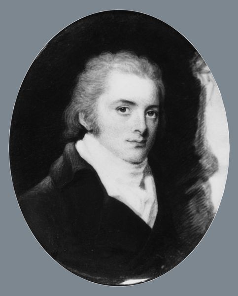 Editor: So, here we have Edward Greene Malbone's "Cornelius George Bowler," created somewhere between 1792 and 1795. It's oil paint, a miniature portrait piece at The Met. I'm immediately struck by its simplicity and the directness of the gaze. What pulls you in when you look at it? Curator: Oh, I love this piece! For me, it's the sense of quiet dignity. You know, Malbone was a master of capturing the personality of his sitters. The neoclassical style meant favoring a reserved elegance. Have you ever noticed how much emotion he conveys with just the subtlest flick of the brush around the eyes? There's a story there, don't you think? Editor: I do. And the almost stark background puts all the focus right on his face. It feels very intentional, almost like a proto-Instagram profile pic, focused completely on the subject! I'm curious – were miniatures common then? Was it like the smartphone portrait of its day? Curator: Precisely! They were intensely popular – think of it as a locket-sized treasure or a token of affection you'd carry with you. Now, do you get a sense of his status or occupation from his dress? Editor: Definitely a sense of status – that cravat looks meticulously tied. Perhaps merchant class? Something that afforded a bit of style, but maybe not aristocratic extravagance? Curator: Interesting! See, I lean toward the learned professions. The subdued colours, the intensity in his eyes. What I would give to know this Cornelius Bowler and see if his reality mirrored my fanciful picture. Editor: It's fascinating how a small portrait can spark such vivid imagining! Curator: Agreed. Art is always a bridge across time, inviting our imaginations to play.