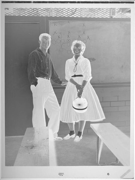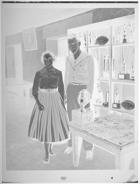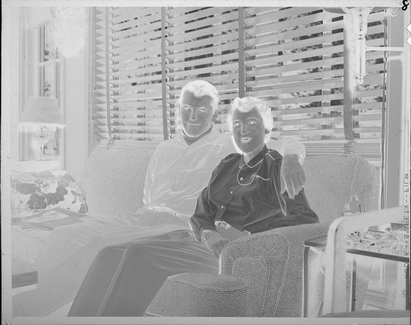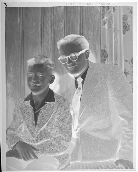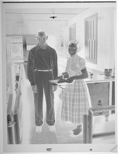 Curator: This is an intriguing, undated photograph by Harry Annas, simply titled, "Untitled (couple standing in doorway on porch)." Editor: The high contrast almost abstracts the figures. There is a curious inversion of light and shadow that destabilizes the familiar, giving a sense of unease. Curator: Indeed. The image captures a couple poised on a threshold, perhaps representing a pivotal moment in their lives, or even reflecting broader societal shifts in postwar America. Consider the constraints and expectations placed on women and men, the performance of gender roles... Editor: I see that, but I'm also struck by the formal aspects: the rigid geometry of the doorway, the interplay between interior and exterior, and how the composition isolates them within the frame. Curator: Perhaps this isolation speaks to the societal pressures and norms that confined individuals, limiting their agency. Editor: Or maybe the contrast simply emphasizes their distinct presence, their forms asserting themselves against the domestic space. Curator: Both valid readings, I think, revealing the photograph's enduring ability to provoke contemplation.
