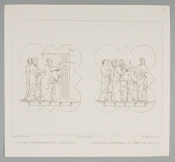 Curator: My first impression is one of stark solemnity. The figures, rendered in such precise lines, feel almost ghostly. Editor: This is Giovanni Paolo Lasinio's depiction of the North Door of the Baptistery of Florence. Lasinio, who lived from 1789 to 1855, documented many Italian artworks. Curator: I see the iconography, the clear narrative of Christ's Passion. One side portrays Christ bound, enduring violence. The other, his judgment before Pilate. It’s a stark duality. Editor: Indeed, we can see this through the lens of power and subjugation. The images evoke questions around the political and social implications of religious narratives, particularly around the construction of victimhood and authority. Curator: The repetition of architectural elements is compelling. The columns and arches—they frame suffering and judgment as eternal, immutable concepts. Editor: Absolutely. These visual echoes underscore how symbolic imagery persists, shaping our understanding of history and faith.