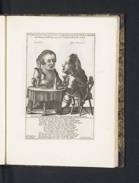 Curator: I’m struck by the intimate nature of this engraving. It feels both playful and deeply embedded within the cultural fabric of its time. Editor: Indeed. This is "Twee dwergen voor de maand december, 1720" by Joost van Sassen, created between 1718 and 1720. A caricature executed in print, it shows us two dwarves seemingly personifying the month of December. The very construction—the linework, the contrast—contributes to an aesthetic both amusing and subtly biting. Curator: Absolutely. Note how the artist employs stark contrasts and careful line work. The characters are vividly defined through posture and adornment. Consider the texture achieved in rendering their clothing—a fascinating application of engraving techniques. However, there is certainly an undercurrent of commentary on social stratification through the dwarven figures acting as symbolic representation of the month. Editor: I agree entirely. It's not just a charming genre scene. The context is crucial: dwarfism was often a spectacle, something pathologized and mocked. Sassen positions these figures amidst signifiers of wealth and leisure, complicating simple interpretations. Their dress, their setting… are we to read this as satire of the elite or as a reinforcement of prejudiced views against marginalized bodies? Curator: An astute point! The opulence certainly raises questions about power structures and how they were being visually represented in the Baroque period. The careful balance of light and shadow, and the details in the clothing, speaks to the era's formal artistic training and attention to realistic depiction of material items in everyday settings. Editor: It’s this friction—the collision of aesthetics and social realities—that makes Sassen’s work so engaging. We’re prompted to examine the underlying beliefs that structured 18th-century Dutch society, beliefs manifested and questioned in art. Curator: This piece stands as a technical achievement of its era, while giving insight into our present considerations of how marginalized bodies are depicted in art. Editor: Yes, bringing discussions on identity and historical narrative to the fore makes for a truly insightful art experience.