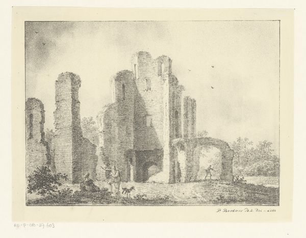 Editor: This etching, "Gezicht op de ruïne van kasteel Kenilworth" by Guillaume Van der Hecht, dating from 1827 to 1879, evokes a sense of melancholy. The ruin itself seems to be reclaiming its space, nature slowly but surely covering the stones. How do you interpret this work in relation to its historical context? Curator: The romantic ruin was a popular theme, wasn't it? However, this goes deeper than just an aesthetic appreciation. Consider Kenilworth Castle's history; it represents power, aristocracy, and ultimately, its decline. Van der Hecht, through the intimate, reproducible medium of the etching, democratizes that fall. We must consider how visualizing decay in art serves as a mirror to societal anxieties around shifts in power, particularly concerning class and the legacies of colonialism, in a time of immense socio-political change across Europe. What emotions do the natural elements intertwined with the architecture provoke in you? Editor: I find a sense of inevitability. Nature seems to be indifferent to human ambition, almost erasing it. Curator: Precisely. It speaks volumes about the impermanence of power structures. Romanticism was not just about beauty, it was about engaging with power, history, and even trauma. How do you see the contrast between the strength of the stone and the softness of the foliage? Editor: The contrast highlights the power of nature but also makes the ruin appear beautiful. There’s something poetic about its decay. It forces us to reckon with change. I now see that it's more than a pretty picture, it's a statement. Curator: Indeed! These artists challenge us to question who gets to write history, and what perspectives are centered. They remind us of the layers beneath our present.