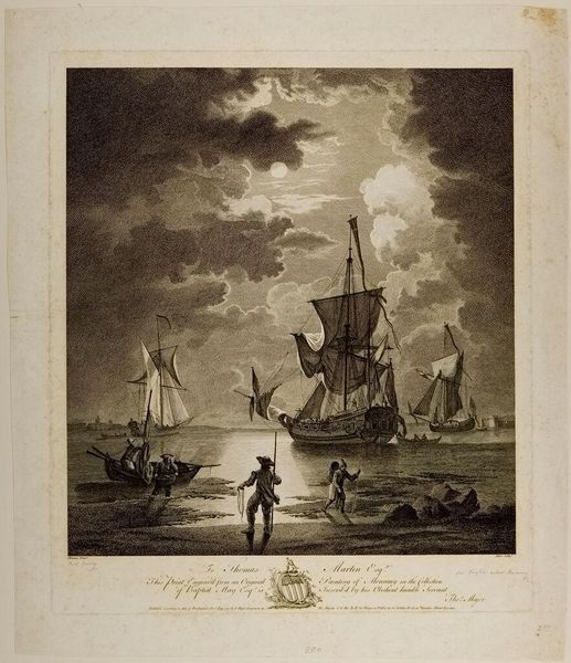 Curator: Here we have William Woollett's "Fishery," a scene teeming with maritime activity, yet rendered with a somber, almost melancholic air. Editor: Wow, the light and shadow—it's like looking into a dream, or maybe a storm-tossed memory. I'm immediately struck by how much is happening, but also by a sense of quiet drama. Curator: This work allows us to consider the socio-economic implications of maritime industries in the 18th century, and how they shape both labor practices and the environment. Editor: I love how the ships cut through the waves. It makes me wonder about the lives of the people on those boats, and the risks they were taking just to make a living. Curator: Exactly. Woollett's composition raises questions about labor, trade, and the individual’s relationship to a larger economic system. Editor: You know, I think I see it differently now. It's a snapshot of a moment in time, but it’s also a huge reflection of human ambition. Curator: I'm glad we could explore this together. Editor: Me too. It's like the art opened up a whole new ocean of thoughts.