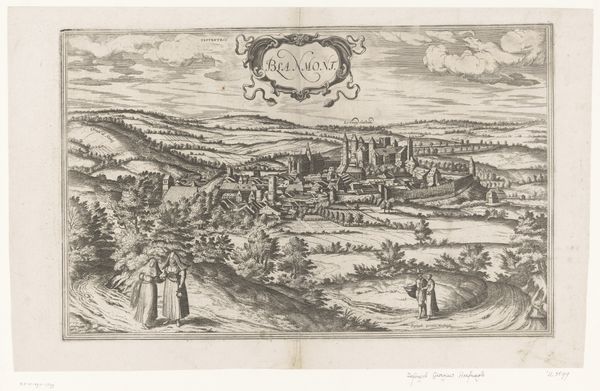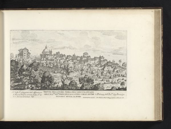 Martin Engelbrecht created this print titled 'Gezicht op de stad Ariccia,' depicting a town in Italy. Engelbrecht was working during a period of significant social stratification in Europe, where class dictated much of life and its opportunities. Looking closely, you'll notice figures who seem to be travelers or locals going about their day. Consider how this landscape, seemingly bucolic, might have different meanings depending on one's position in society. For the wealthy, it might represent leisure and the picturesque, while for the working class, it was perhaps merely the backdrop of daily labor. Engelbrecht's print invites us to think about the varied experiences within the Italian landscape and prompts us to consider how class shapes our interactions with the world around us. The artwork encapsulates the personal and societal contexts, which, even today, influence our relationship with place and identity.