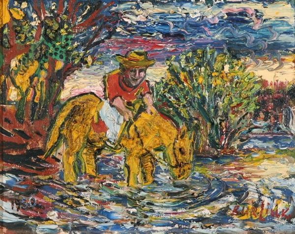 Curator: This painting, "Woman with Horse," artist not stated but likely David Burliuk, seemingly executed in oil paint, it just explodes with texture. The thick application really makes the materiality unavoidable. What catches your eye? Editor: It's the impasto, definitely. I mean, you can practically feel the brushstrokes. And the scene itself…there's a woman, sort of casually leaning against a horse in this very raw landscape. How do you even begin to interpret a piece so focused on the tactile experience? Curator: Consider how the materiality impacts the subject. The impasto isn't just decorative; it's work, physical labor. Burliuk built up these layers, constructing the scene much like one might construct a landscape in reality. How does that manual effort, that evident labour in the paint application, relate to your understanding of 'landscape' itself? Editor: So, the way he handles the paint, almost sculpting the image, connects to how we interact with, and even change, the physical world around us? It's less about representing the natural world and more about showing the active making of the world? Curator: Precisely! This piece collapses distinctions between creation and representation. It's oil paint, ground pigments, becoming landscape. Where did these pigments come from, who made them? Burliuk asks the viewer to consider where things come from. Are we looking at landscape, or raw material, refined and delivered through a consumer-industrial chain to make an artist's dream? Editor: That's... wow. I'd never considered how the very materials used impact how we see the subject portrayed. Now I see layers of consumption here! Curator: The means of production, in the service of expression! Always informing each other. I found this surprisingly evocative. Editor: Me too! I’ll never look at impasto the same way.