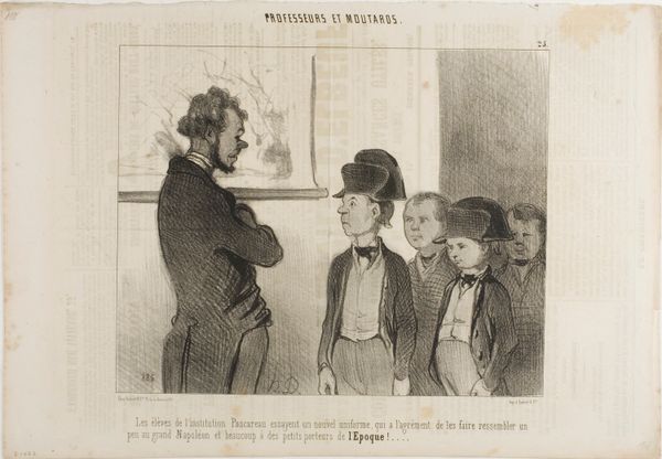 Curator: This lithograph by Honoré Daumier, created in 1846, titled "\u201c- Please no exaggerations in this article which goes to all the newspapers. Write only that our pupil Greluchot has received fourteen prizes and that there is no doubt that the Institute Bilboquet is the finest in all of Paris!,\u201d" offers a glimpse into 19th-century French society. It’s quite striking, don’t you think? Editor: Absolutely. I find the expressions on the faces incredibly engaging. The composition, with the teacher looming over the students, really emphasizes a sense of… I don’t know, almost comical authority? What specifically catches your eye when you look at this piece from a formal perspective? Curator: Observe how Daumier employs contrasting values—dark lines defining the figures against a lighter background—to sculpt forms and direct the viewer’s attention. Note, particularly, the pronounced use of contour lines. What do you see happening there? Editor: I see it! The heavy lines give a weightiness to the figures, especially the teacher. It's as if their physical presence is directly tied to their role in society, a visual shorthand for authority and status? Curator: Precisely. Also consider the strategic use of hatching and cross-hatching to model the forms, lending volume and depth to the characters, thereby enhancing the satirical effect. What impact do these structural elements create in your mind? Editor: I see. The controlled chaos of the linework somehow reinforces the chaotic nature of what he says in the caption! What's especially insightful for me is recognizing how the lines create both form and commentary. Thanks! Curator: A closer look always yields rewards. Every element contributes to a cohesive and thought-provoking statement, reflecting societal attitudes of the time, wouldn’t you agree? Editor: Definitely. Considering your approach gives me a clearer understanding of art. Thank you so much!