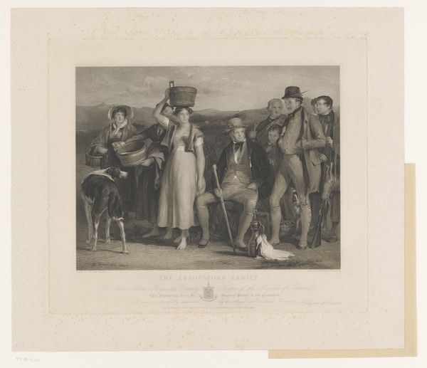 Curator: Welcome. We are looking at "Oogstfeest," or "Harvest Festival," a print made by Théophile Victor Desclaux in 1844. Editor: It looks like a snapshot from a much earlier time. The detailed engraving captures this procession or celebration, and there’s a real texture to the landscape. I can almost feel the rough spun cloth and see the grain of the wood in the wagon. Curator: The image reflects a specific romantic view of peasant life that was popular then, a kind of nostalgic look at rural traditions during a period of industrial change. The harvest, naturally, becomes a symbol. Editor: Symbol, yes, but look at the actual labour depicted, not idealized but also not dismissed. There's an acknowledgment of hard work in that procession, from the clothing they wear to the tools or instruments they carry. The weight of their lives, I suppose, as workers and community members. How does that connect with our modern ideas about art? Curator: Absolutely. The engraving would have been disseminated widely, available for viewing in homes and public spaces, reinforcing shared notions about the value of agrarian life, while, it is an artistic creation crafted in print workshops serving very different interests. Consider the social position of someone who would produce and sell a detailed romantic view, a delicate craft. Editor: Interesting! The artist becomes another kind of worker within that frame. One supported, ideally, by this image's social resonance as more than art but craft itself. Curator: Precisely, and that resonates powerfully, making me reflect on labor then, and consumption today. Editor: This print, more than just a picture, shows what society values, its roots—literally and figuratively—through its art. Curator: And how easily these depictions become part of national identities or artistic movements as a result of accessibility through this medium. Editor: Indeed. This offers not just aesthetic insight, but also some material realities worth exploring.