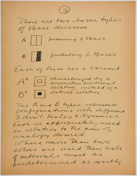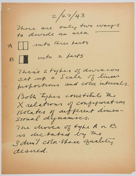Curator: Stuart Davis, best known for his modernist paintings, wrote extensively about art. This sheet, titled "Art Theory Text with Types A and B Configuration Diagrams," features his handwritten musings and some rudimentary diagrams. Editor: It feels like a glimpse into his thought process, a visual representation of how he was trying to break down and understand form. Almost like looking at notes from a mad scientist! Curator: Absolutely. Notice how he connects the emotional and intellectual forces that form a picture with the limitations of material and process. The diagrams seem to serve as a visual shorthand for these ideas. They represent these elemental forms. Editor: Yes, like a quest for the most basic building blocks of visual language, stripping everything down. His handwriting has a certain energy, doesn’t it? It adds to the feeling that he was really working through something complex. Curator: Davis sought to create a distinctly American form of modernism. He wanted to find a visual equivalent to the rhythms of jazz and the energy of urban life. This sheet offers a glimpse into that search. Editor: It's fascinating to consider his art theory, to ponder on the topography of a picture and the emotional forces behind it. It makes you appreciate the depth of thought that can go into even seemingly abstract compositions.