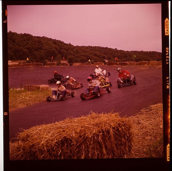 Editor: This photograph by Jack Gould, currently titled "Untitled (drivers drag-racing in tiny cars)," shows a go-kart race. It feels very immediate and captures a specific moment. What stands out to you? Curator: I see the traces of production, the analog film’s grain, the borders with the word "Kodak" printed along the edge. These elements root the image in a specific time and place of material culture. How does this process influence your interpretation? Editor: It makes me think about accessibility to the medium. Was photography like this only available to certain people? Curator: Precisely. The consumption of photography, the labor involved in its creation, and its reflection of leisure activities all point to broader social structures. It provides a glimpse into a specific culture and raises questions about who could participate in this activity. Editor: I never thought about it that way. Now I understand why paying attention to the material matters!