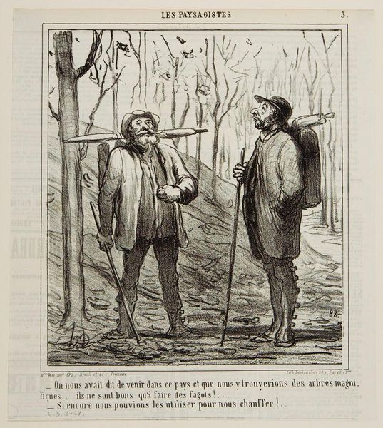 Curator: Honoré Daumier, known for his social commentary, created this image, titled "Information." It's a lithograph, a printmaking technique allowing for broad distribution. Editor: The stark contrast of the black ink on the white paper really heightens the caricature. The figures seem very exaggerated, almost grotesque. Curator: Daumier's lithographs often appeared in newspapers like Le Charivari. This work comments on the realities of rural life and social interactions of the period. The hunter’s inquiry becomes an opportunity for social critique. Editor: I see the lines directing our eyes to the expressive gestures—the woman’s pointing finger and the hunter’s quizzical look. It really does create a clear focal point. Curator: Right. The positioning of the subjects makes the viewer complicit in the scene. We are, in a way, eavesdropping on this exchange. Editor: It seems Daumier is drawing a very unflattering picture of both figures, though. It makes one wonder what he is really commenting on. Curator: Exactly. Daumier's work challenges viewers to consider the nuances of everyday life and the unspoken social dynamics at play. Editor: Seeing it through that lens, it goes beyond a mere hunting scene.