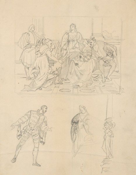 Editor: This is Jacques-Louis David’s double-sided sketch, "Napoleon Crowning Josephine." It looks like a preliminary drawing. What strikes me is how stark and almost unfinished it feels. What symbols or meanings emerge for you when you look at this? Curator: The act of crowning itself is laden. Who is granting the power? Note how Napoleon crowns Josephine himself, rather than receiving the crown from a Pope, thereby wresting control and consolidating symbolism. Editor: So, the imagery reflects a shift in power dynamics? Curator: Precisely! It embodies a cultural rupture, signaling a new self-made order, and perhaps hinting at Napoleon's ambitions to redefine the very concept of emperorship. Editor: I see how David captured that ambition through the symbolism of the coronation. Thanks!