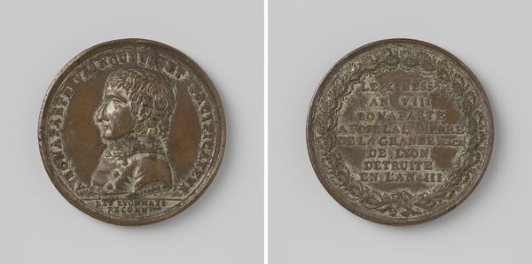Editor: This is a commemorative metal relief, crafted in 1814 by Hendrik Lageman. It marks Willem Frederik, Prince of Orange, as sovereign prince, inaugurated in Amsterdam. It feels quite formal and stoic, even for a coin. I’m struck by how it attempts to encapsulate such a pivotal moment in history. What symbols or meanings jump out at you? Curator: Consider how coins function within a society; this object isn't merely currency but a tool of memory. The portrait, facing left in the Neoclassical style, suggests stability and authority through the leader’s idealized image. But the inscription, "Ghuldigd te Amsterdam MDCCCXIV" speaks directly to an act of submission, a ritual acknowledging power. Editor: Submission? I hadn’t considered it that way. The inscription felt more celebratory. Curator: It is both, isn't it? It carries both connotations of honor and perhaps a shadow of the events it tries to capture so linearly. The wreath surrounding it may suggest peace and victory. Why commission a commemorative coin instead of, say, a painting? Editor: To be distributed widely, I guess. As a more practical symbol? It’s like disseminating power and legitimacy. Almost like planting an idea. Curator: Exactly. What kind of ideas do you think the designer tried to communicate? The continuity, transition, and the weight of leadership? Editor: Definitely the weight – literally in the metal itself, but also metaphorically in terms of historical importance. I’ll never look at a coin the same way! Curator: Me neither, let's see what further symbols coins can unlock!