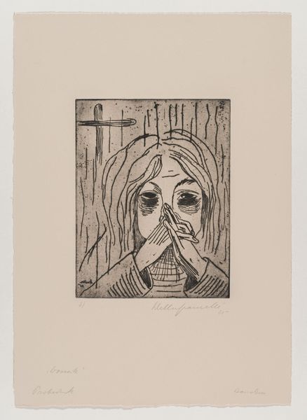 Editor: Here we have Leona Pierce Frasconi's "Sand Pail," a linocut print from 1950. It's a striking image, isn't it? The strong contrast of black and white gives it a powerful, almost stark quality, and there’s a lot of emotional intensity concentrated on the person featured. What do you see in this piece? Curator: Well, beyond the technical mastery of the linocut—the sharp lines, the clever use of negative space—I see a glimpse into childhood imagination. That sand pail with the tiny fish in it... it's like a miniature world, isn't it? The subject looks totally absorbed, completely lost in their private universe. Editor: Yes, and something about the figure, cloaked, hooded and crouched feels isolating. What do you make of that? Curator: Indeed. Notice the high contrast between the brightly illuminated subject versus the densely dark brickwork background— the world feels closed off behind them. The person, caught in an act of imagination, is shielded from something looming and imposing, but whether that looming thing is reality or a social obstacle isn't as obvious. Is that intentional or am I imposing myself on it? I am reminded of times from my youth. What do *you* make of it? Editor: I think you're right, there's definitely a sense of retreat, of creating a safe space within the larger world. The title also highlights what should be childlike and everyday-- "Sand Pail," something one might see on a beach-- rendered with great complexity of the mind. I hadn’t quite seen that before. Curator: Art reveals itself bit by bit like that, and we, the observers, evolve along with the observation. That makes experiencing art feel intensely human. Editor: Exactly! Thank you so much for your insights. I have a new perspective on the piece, and I think our listeners will, too.