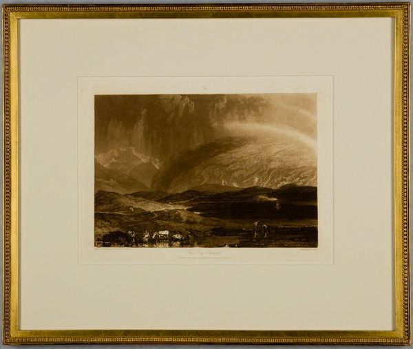 Editor: This is Turner's "Lake of Thun." It’s a print of a landscape, full of brooding skies and what looks like lightning. How do you interpret this work? Curator: Turner’s landscapes often tap into the sublime, that overwhelming feeling of nature's power. Notice how light pierces through the dark clouds. Lightning, a symbol of divine power, suggests a world beyond human control. Editor: So, the storm isn't just weather; it’s symbolic? Curator: Precisely. Think about the figures on the shore – small, almost imperceptible. They are dwarfed by the immensity of the lake and the mountains. The image might be an allegory for the human condition: fragile and temporary in the face of eternity. Editor: That makes me see the print in a new, more profound way. Thank you!