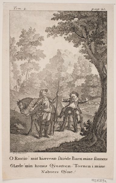 Editor: This is Ferdinand Kobell's "Two Boys and a Girl," date unknown, housed at the Harvard Art Museums. It's an etching, and the children seem to be playing in a wooded area. How would you interpret its historical context? Curator: Consider the late 18th century. The idealized image of childhood was becoming increasingly popular, and we see that reflected here. Kobell presents them in nature, seemingly innocent and carefree, a visual representation of burgeoning Romantic ideals. Editor: So, it’s less about depicting reality and more about promoting a certain view of childhood? Curator: Precisely. This image likely resonated with a specific, privileged audience who could afford to indulge in such sentimental representations. Does it make you reconsider its surface charm? Editor: It does. It's a reminder that art, even something as seemingly simple as this, is always shaped by the society it exists within. Thanks! Curator: Indeed! It's fascinating how art both reflects and shapes our understanding of childhood and society.