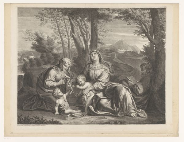 Curator: This print is titled "Rinaldo and Armida" by Angelica Kauffmann, created sometime between 1762 and 1779. It’s an engraving that portrays a scene of romance and enchantment. Editor: My initial impression is one of dreamy melancholy. The figures are so tenderly entwined within this incredibly detailed forest, but the monochromatic palette and dense foliage create this pervasive sense of being watched or trapped, somehow. Curator: That feeling certainly connects to the historical context. Kauffmann was navigating the art world, which was dominated by men, whilst building an enormously successful career for herself. She made shrewd decisions regarding the printmaking of her designs as it was an accessible medium, a business model, enabling wider distribution and generating income as well as enhancing her fame. This print relates to themes prevalent in the late Baroque and early Romanticism – where idyllic love scenes meet darker undertones, possibly highlighting a nuanced commentary on female agency, perhaps? Editor: That rings true. It's funny, looking closer, you see this almost voyeuristic figure peering through the trees in the background – literally watched, a narrative woven into the fibres of the image! I’m also struck by the delicate lines and shading. You can almost feel the softness of the fabrics and the cool earth beneath them, like you want to be there. There’s an intimacy in the presentation, it is as though Kauffmann wants us, the viewer, to connect with Armida. Curator: Absolutely, the detailed lines were typical of engraving, allowing for replication and broader accessibility, aligning Kauffmann's artistry with broader commercial and social dynamics, effectively democratising her storytelling and images for consumption. Editor: Considering Angelica Kauffmann's innovative approach, as well as how printmaking disseminates the message of this image across society... it invites a real appreciation for what is happening here, the labour and business within art. Curator: A poignant synthesis. This print not only captures a tender narrative, but also reveals how social dynamics intersect artistic production and reception, prompting us to consider the intricate connection between art, enterprise and society during a formative era. Editor: Leaving me feeling reflective of a tender interaction that feels anything but with its wider considerations and interpretations. Thank you for unpacking "Rinaldo and Armida", it certainly pulls the heart strings with some interesting societal thoughts and realities.