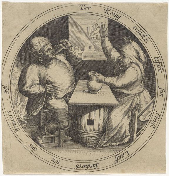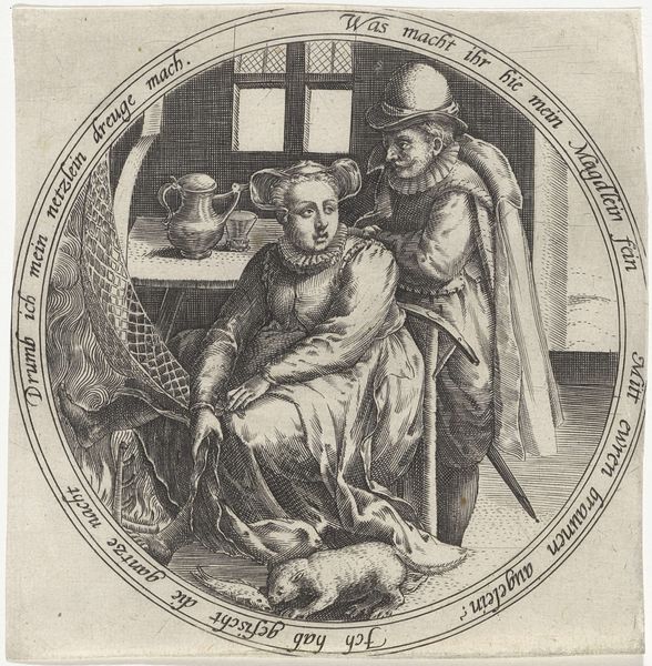 This print, "Boerenpaar in een interieur," shows a peasant couple in an interior setting, and was made by an anonymous artist. The intricate lines are a testament to the engraving process used to create it. The artist would have meticulously carved the image into a metal plate, likely copper, using specialized tools called burins. The density and fineness of these lines dictate the tonal range of the print, from the darkest shadows to the lightest highlights. Look closely and you'll notice how the artist varied the line work to describe the scene before us. Notice the way light reflects off the jug, the folds of the costumes, the texture of the wall, and the expressions on the faces of the man, the woman and even the dog. The work provides insight into the artist's technical skill, and also gives us a glimpse into the society that produced it, inviting us to consider the daily lives and social dynamics of the working class. By understanding the materials, processes, and the context in which art is made, we gain a deeper appreciation for its meaning.