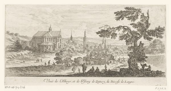 Curator: Images like this engraving, "Landschap met huizen en boeren" created after 1756 by Martin de Monchy, invite us into a world thick with unspoken narratives. Editor: This engraving is quite detailed. It looks like a scene returning from a festival, very busy. So, what stands out to you? Curator: Notice the symbolic weight embedded within the architecture and figures. The houses almost stand as silent witnesses, their forms echoing a sense of established societal structures. Do you see the slight caricatures in the figures? Editor: I see it, but the style seems to indicate something about everyday life rather than a biting criticism. Am I understanding correctly? Curator: Precisely! These weren't simply portraits, they acted almost like morality plays, subtly instructing viewers about social behaviors. The figures' interaction becomes a language of decorum, each gesture loaded with social meaning. Editor: So, beyond just showing people, the artist is telling a story with visual cues? Almost like little embedded messages that reflect cultural values and societal expectations through a symbolic narrative. Curator: Yes! Each tree, each pathway becomes a symbol loaded with collective understanding, and perhaps individual interpretations filtered through a cultural lens, shaping identity and influencing perception. Editor: That really makes me consider how deeply ingrained these visual codes are. Thank you. Curator: It’s in such study that we discover the richness and power of images through time.