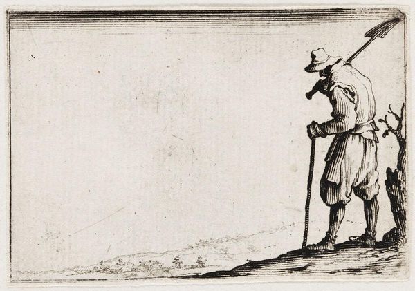 Curator: This is Jacques Callot's "Hunchback with a Cane," a miniature etching measuring just 6.3 by 9 centimeters, residing here at the Harvard Art Museums. Editor: My first impression is one of... burden. The exaggerated lines create a figure weighed down, not just physically, but perhaps by something more. Curator: Indeed. Callot's mastery lies in the economy of line. Notice how the hatching defines volume and texture, creating a dynamic sense of movement within such a compact space. Editor: And the cane! A symbol of support, of course, but also perhaps of vulnerability. It points forward, but the figure's gaze is averted, creating a sense of internal conflict. Curator: Structurally, the hunched back creates a powerful diagonal, anchoring the figure, while the hat's feather offers a whimsical counterpoint. The composition is brilliantly balanced. Editor: It's the persistent imagery of the burdened wanderer that resonates, isn't it? A character type that appears in folklore and art across cultures, representing our shared struggles. Curator: Precisely. Callot's technical skill serves a deeper purpose, revealing layers of meaning within this seemingly simple image. Editor: A potent image, indeed. We've barely scratched the surface of its layered meanings.