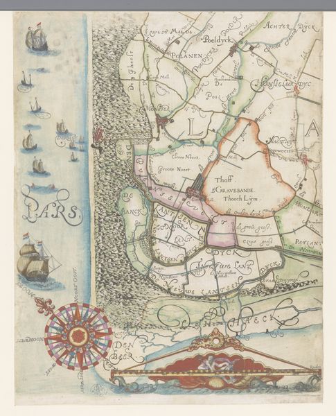 Curator: This artwork, “Kaart van het Hoogheemraadschap van Delfland, met Den Haag en omgeving, deel links midden,” offers us a glimpse into the 17th-century Dutch landscape. Dating roughly from 1611 to 1692, it’s a watercolor map held at the Rijksmuseum. What’s your immediate reaction to it? Editor: The pastel hues are rather soothing! The hand-drawn features of the dunes and sailboats evoke a sense of quietude, almost meditative. But behind this serene aesthetic, there’s an implied narrative of land management and control. Curator: Exactly. This isn't just any pretty scene; it's a highly functional document. These detailed renderings weren't merely aesthetic exercises but rather, vital tools for governance, asserting control over land and water, deeply important for the prosperity of the Dutch Golden Age. The Dutch are legendary for these feats of hydrological engineering. Editor: It reflects a society actively reshaping its environment to suit its needs, a constant negotiation between people and nature. We must consider, who benefited from these landscape interventions and at what cost? How did these power dynamics manifest in the visual representation of the land? The inclusion of polders and waterways speaks to Dutch innovations, yes, but it also embodies a colonial ambition to manage and possess the environment. Curator: The artist, Floris Balthasarsz van Berckenrode, really captured this sense of ambition. Notice how the lines between land and water are so clearly delineated. It makes one wonder: where did this drive to categorize and manage everything stem from? The act of naming parcels of land, of organizing, almost possesses that space. Editor: Precisely! Map-making has always been deeply entangled with power structures. Cartography isn't merely descriptive but a powerful form of world-making, inscribing certain social and political orders onto the territory it represents. I wonder, who had access to these maps? What types of negotiations happened behind these divisions and inscriptions of power? Curator: Considering this map now, it becomes a record of a bygone era's dreams and ambitions. The calm colors give way to images of hard fought political control over land. Editor: Definitely, seeing it through this lens underscores the power of art, as not just representation but an embodiment of human-environment interactions.