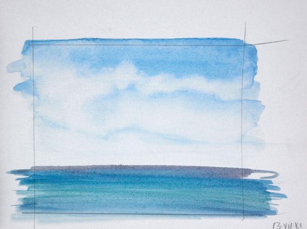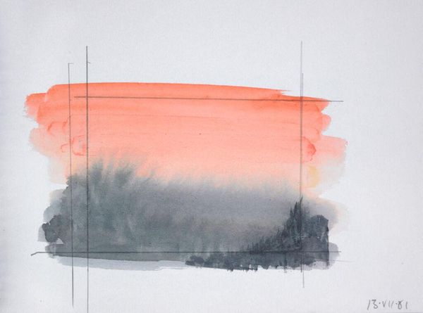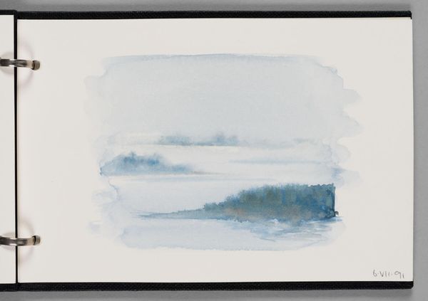 Editor: So this is Elena Prentice’s watercolor, "Landscape." It's pretty small, just a fragment really. The colors are so dreamy, but the hard lines framing the image feel a little cold. What do you make of it? Curator: Well, it’s like capturing a fleeting moment, right? A memory, perhaps? The frame, you see, is like holding onto something, not letting it drift away entirely. I think it is a landscape of mind as much as geography. Editor: That’s an interesting perspective. It almost feels like a study, the way the colors bleed and blend. Curator: Yes, and those bleeds, they're not mistakes. They're the essence of the moment escaping the frame! What do you think she’s holding onto here? Editor: I think it is the calm of a sunset, a memory of a peaceful place. I see the beauty in those bleeds. Thanks for sharing your thoughts. Curator: My pleasure! It’s always lovely to see how others connect.