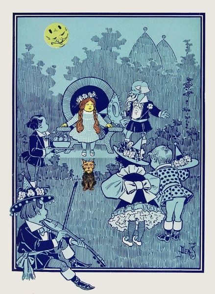 Curator: William Wallace Denslow’s "These people are all made of china", created around 1900, immediately strikes me as enchanting. The color palette is whimsical. Editor: It has the same decorative feel that’s so characteristic of turn-of-the-century illustrations, but the content puzzles me. It presents these paper-thin figures on pedestals. Who do you think the intended audience for Denslow's paper artwork would be? Was it simply to create an engaging visual for a children's tale or something more profound? Curator: Denslow made these to accompany his illustrative work on “The Wonderful Wizard of Oz” a book that certainly shaped turn-of-the-century society. The image suggests a blurring of fantasy and reality, potentially reflecting a childlike imagination and an allegorical take on society where everyone is easily breakable. We might ask, what cultural values do they represent? The figures have similar outfits, although their activities on their own are completely separated. Editor: You are focusing on the cultural value of these images, but there is an aspect to their materiality as well, it's just flat on a surface with paper medium. As the original material, its function may not have simply been aesthetic or storytelling alone; the pieces, their fragility. Curator: Their composition makes sense given that many forms of paper entertainment for the young have similar patterns to their materiality—playing cards, stencils, illustrations in a children’s story book for learning—paper is readily accessible. They underscore the importance of materiality for an understanding of both artwork and life itself. Editor: Indeed, it prompts me to consider the physical engagement between the child and their games. Are these illustrations of material to play, cut, build? How does that influence how children learn or use their imagination through tactile means? Curator: I see these playful patterns of distribution in "These people are all made of china," but they're presented flat and frontal for the gaze, to entertain children who can learn through these very images. They certainly allow room for imagining complex themes of society. Editor: This approach emphasizes process and reception rather than aesthetic values; the materials used determine a great deal about function and utility. Denslow really delivers these notions through imagery. Curator: I can see what you mean by exploring all the material considerations with paper medium—they bring their own value. Thanks to this visual structure, we can come away with the impression of these cultural values more closely. Editor: Thank you; I appreciate that observation. The dialogue and contrasts between our viewpoints helps show different points.