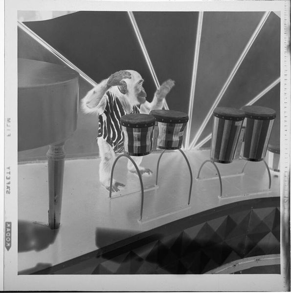 Curator: Jack Gould's small black and white photograph, held at the Harvard Art Museums, pictures chimpanzees playing musical instruments; it's titled, simply, "Untitled (chimps playing piano and drums)." Editor: My first thought is the overwhelming melancholy. Despite the playful subject, there's a certain flatness, emphasized by the gray scale and geometric backdrop. Curator: Note how the chimp in the zebra-striped shirt mimics human activity. The image perhaps speaks to our persistent desire to project our own behaviors, and perhaps our aspirations, onto the animal kingdom. Editor: I am drawn to the composition, particularly the stark contrast between the organic curve of the piano and the chimpanzee and the rigid lines of the background. It introduces a tension. Curator: The image raises interesting questions about performance, entertainment, and the cultural narratives we construct around animals. It speaks to a kind of spectacle and the commodification of nature. Editor: Indeed. Examining the formal elements, the photographer captures a certain stillness that belies the implied action of the performance. Curator: Ultimately, it is a photograph that, regardless of its original intention, now carries layers of complex meaning. Editor: It gives us a lot to think about, doesn't it?