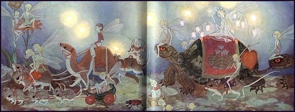 Charles Robinson made "The Remarkable Rocket" using watercolour and ink, and it's just bursting with detail. Look closely, and you'll see the pale, dreamy palette, with these tiny, precise ink lines creating a real sense of texture, even an air of fantasy. I find myself drawn to the way the reindeer's harness is rendered – all these delicate swags and tassels, picked out in the daintiest detail. Robinson doesn't just describe; he embellishes, creating a surface that invites you in, makes you want to touch it, even though you know you can't. It reminds me that making art is an act of love, a commitment to detail, and a generosity of spirit. There is something about the theatrical staging and overt exoticism that reminds me of Erte. Both artists seem to share a love of pattern and ornament and a sense of art as transformative and immersive. You could get lost in these images, and that is entirely the point.