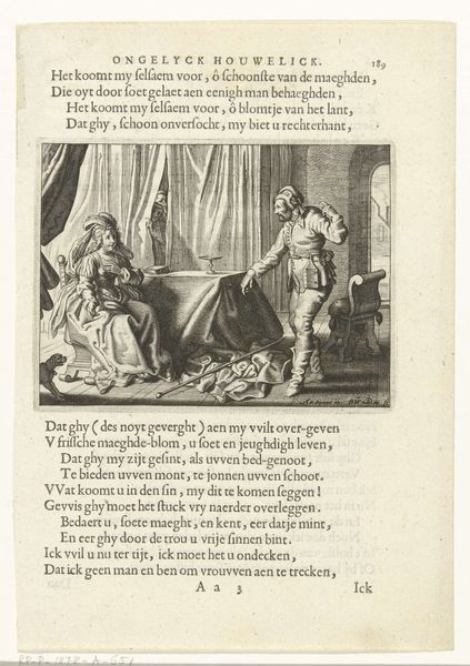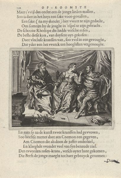 Curator: Here we have a c. 1635 engraving by Daniël van den Bremden, titled "Emma en Einhart." Editor: The image feels weighty. There's a strong contrast between light and dark, almost theatrical. Curator: Bremden captures a historical scene with a dramatic flourish typical of the Baroque style. It depicts Emma and Einhart; it's a scene of confrontation, or perhaps forgiveness. Consider the labour-intensive process of engraving, the material of the copperplate, the tools employed… Editor: From a purely compositional view, observe how the artist uses linear perspective, leading the eye into the scene. The figures are arranged almost like a tableau, balanced and deliberate. What narrative purpose does this arrangement create, do you think? Curator: The figures are not simply placed; they represent power dynamics. The figure kneeling shows vulnerability, subjugation. The standing figure with the sword exudes authority, both instruments and signifiers. The text overlaid speaks to cultural contexts; we are observing historical and social values in tension. Editor: Semiotically, the sword acts as more than just a weapon. It's a visual metaphor, of control and consequence; and its position, hovering near the kneeling figure, makes tangible what might be a philosophical dilemma, using lines, forms and shapes. What meanings are thus produced, reproduced, reinforced or resisted? Curator: What's interesting to consider are the modes of artistic production itself. How does it embody class structures through its function? These were mass-produced and consumed. What values and beliefs about class did prints reinforce within 17th century society? Editor: Perhaps in analysing "Emma en Einhart", both historical weight and formal grace intertwine. Thank you for your observations! Curator: My pleasure; I think we can agree that it offers plenty of interesting ideas for consideration.