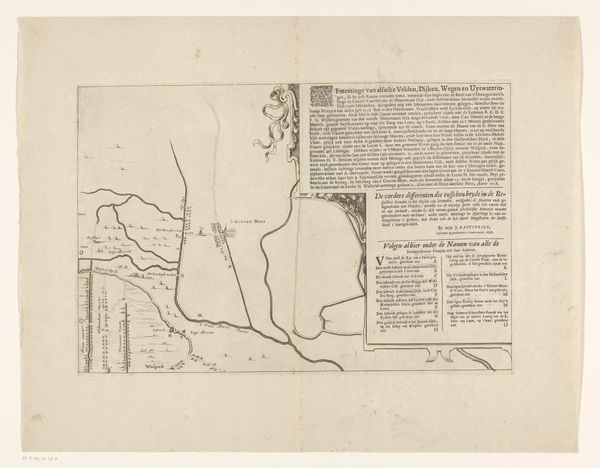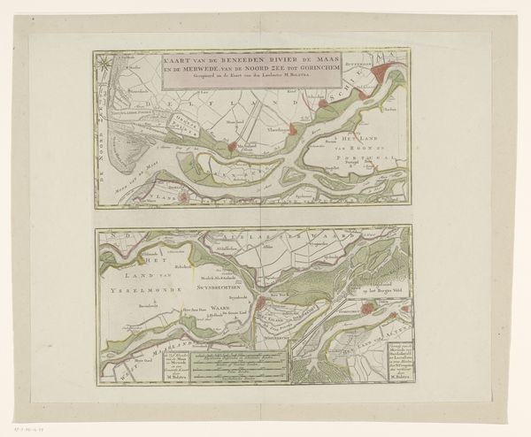 Curator: This meticulously rendered drawing, dating back to 1705, is titled "Slagorde van het Franse leger achter de rivier de IJse," which translates to "Order of Battle of the French Army Behind the IJse River," attributed to Samuel Du Ry de Champdoré. Editor: It strikes me as almost unnervingly neat. The colors are muted, almost fragile, given that it represents military strategy and, inevitably, violent confrontation. The controlled lines… are these watercolor and ink, mainly? Curator: Indeed. We see a mixed application of ink and watercolor on paper. Look at how precisely the topographical layout is rendered, showing the positions of the troops in relation to the river. What’s compelling is understanding the production of such images. These aren't paintings meant for aesthetic appreciation; they served very specific functions within a military-administrative context. The choice of paper, ink, and watercolor makes for a portable document, readily duplicated and disseminated amongst strategists. Editor: I agree. Though, from an iconographic point of view, notice the symbolic weight given to the river. Rivers, throughout art history, have marked both division and passage. Is the "IJse" intended to offer strategic depth, protection? Curator: Absolutely, the river functions as a defensive barrier, strategically deployed. But more than that, this rendering and dissemination emphasizes how crucial it was to organize the theater of war itself as a resource – to catalogue it through paper. The image’s very materiality became central to the management of resources and planning that made up a war effort. Editor: That is undeniable. Look closer. The carefully placed encampments— tiny symbolic representations—are these signifiers, in their placement, attempting to visually communicate ideas of order, strength, perhaps even invincibility? This order mirrors aspirations of political dominance and cultural expression, it’s as if control is represented by way of organized spatial presentation. Curator: A very good point. It also pushes the art historical discourse in new directions, where questions about process, materials, distribution are at the forefront. It reconsiders existing ideas regarding hierarchies linked to materials and production practices, such as supposedly neutral practices such as "drawing." Editor: Precisely. In looking at this piece, its careful symbols in mind, its historical value isn’t simply descriptive; it's a glimpse into how strategy becomes visualized – how lines on paper translate into the movement, potential loss, and, ultimately, a remaking of territories. Curator: An image, and object, revealing its significance beyond solely what it depicts. Editor: Leaving us, now, with a greater understanding of visual-strategy through cultural meaning and human intention, revealed from war itself.
