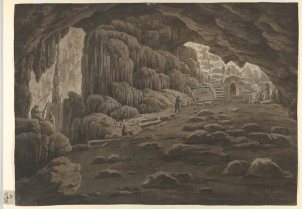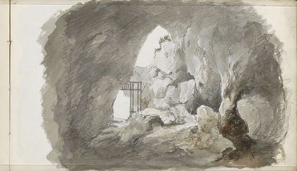 J.F. Clemens created this etching, "View through a Rock Arch," using a metal plate to produce a print of stark contrasts. The eye is drawn from the textured darkness of the vault to the light-infused landscape beyond. Consider how Clemens uses line and shadow to define space. The rough, dense strokes of the cave contrast with the smooth, horizontal lines suggesting the distant plains. This interplay creates depth, but it also destabilizes our sense of perspective. Are we inside, looking out, or are we outside, looking in? This manipulation reflects the period’s interest in the sublime—an aesthetic category where awe mixes with terror, challenging fixed notions of beauty and order. Clemens’s print functions semiotically, using the cave as a signifier of the unknown, while the landscape represents enlightenment. The work invites us to question our perceptions and the boundaries between safety and the sublime.