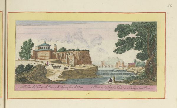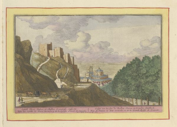 Editor: So, this is "View of the buildings of the Alhambra in Granada" by Pieter van den Berge, sometime between 1694 and 1737. It's a print using etching and watercolor. I'm really drawn to the almost dreamlike quality of the scene. What do you see in this piece? Curator: The power of images like this lies in their cultural memory. It presents a detailed, almost cartographic image of Granada but, think about what the Alhambra meant then. To many Europeans, it symbolized the lost glories of Islamic Spain, a reminder of a cultural exchange and conflict that shaped the continent. The inclusion of figures on the road, almost dwarfed by the architecture, emphasizes human transience against enduring history. Does the almost detached rendering of architecture suggest any particular view? Editor: That's interesting. I hadn't thought about it as representing a clash of cultures, more of just an idealized landscape. Now that you mention it, the architecture does seem kind of...distant. It's beautiful, but not inviting. Almost like a memory, like you mentioned. Curator: Exactly! It's not merely a record but also a romantic interpretation, loaded with the weight of historical perception and cultural meaning. Note how the use of watercolor softens what could be stark etched lines. Doesn't that contribute to this sense of dream-like recall, softening sharp edges of past conflicts, emphasizing beauty but reminding about the passage of time and transformations? Editor: I see what you mean. The watercolor makes it feel more like a story than a factual depiction. More poetic. The colours also adds some beauty. Curator: Precisely! This "View of Alhambra" presents layered visions and voices resonating through historical symbols that inform us today. A memory, as you say, captured, shared, passed on. Editor: It makes you wonder what stories the artist knew, and how much he put into the image. It’s far more intricate than I initially appreciated!