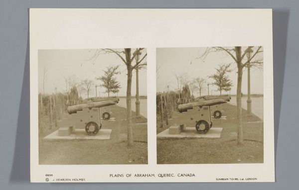 J. Dearden Holmes captured this stereo card image of the cannons on the Plains of Abraham in Quebec. Here, we see cannons, symbols of power and conflict, resting silently on the grounds where a historic battle once raged. Cannons as instruments of war appear throughout history, from ancient siege weaponry to modern artillery, each iteration bearing witness to human conflict. Yet, these cannons, now still, remind me of the cyclical nature of history. The dormant tree in the image perhaps represents the potential for renewal and growth, contrasting with the destructive force the cannons once represented. Consider how the visual metaphor of weaponry evolves: from the spears of antiquity to the firearms of the modern era, each reflects technological advancement and shifts in power dynamics. They all evoke primal fears and aspirations, tapping into our collective memory of conflict and survival. The cannons, therefore, transcend their physical presence. They become symbols, resonating with the past and hinting at the future.