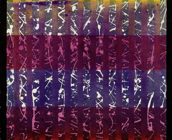 Editor: So, this is Patrick Hayman's "Birds and Trees," date unknown, housed at the Tate. It's a small print, dominated by a deep purple and thin white lines. It feels almost like a memory, fragile and a little cryptic. What do you see in this piece? Curator: It feels like a half-remembered dream, doesn't it? The stark contrast and simple lines give it a raw, almost primal feel. Do you think Hayman was trying to capture the essence of nature, rather than its literal form? Editor: Perhaps. It's like he's stripped everything down to these basic symbols. Curator: Exactly! And that diamond shape at the top... is it a star, or something more abstract? Maybe Hayman is nudging us to look beyond the obvious, to find our own meanings. Editor: I like that. It makes me want to revisit my own relationship with nature. Curator: Me too. Art’s funny that way, isn’t it?