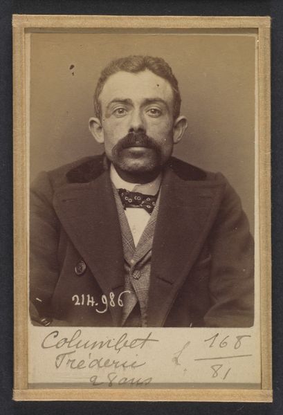Editor: We’re looking at a photograph taken by Alphonse Bertillon in 1894, titled "Ruaud. Jean-Baptiste. 35 ans, né à Limoges le 28/7/58. Cordonnier. Anarchiste. 4/2/94." It feels stark, very direct. What’s striking to me is the way the light catches the planes of his face. How do you interpret this work through a formal lens? Curator: The power of this piece lies in its unadorned realism. The composition is strictly frontal, and the monochromatic palette eliminates any distraction from coloristic elements. The subtle gradations of light across Ruaud's face and clothing are significant; notice how they model the contours, creating depth in what would otherwise be a flat plane. The photographic medium itself is key – the sharp, unidealized rendering is crucial. How does the text interact with the image, in your opinion? Editor: Well, the text seems very matter-of-fact – his name, age, occupation, even his political affiliation are recorded. It feels almost scientific in its detached approach. Does that affect how you see the visual elements? Curator: Precisely. The addition of the text, seemingly objective, emphasizes the constructed nature of the image itself. Consider the geometric structure inherent in the frame, how it contains and isolates the subject. It speaks to power, control, the imposition of order upon an individual. It forces a reading that goes beyond simple portraiture, wouldn't you agree? Editor: I see what you mean. At first glance it feels like a simple portrait but thinking about the composition and framing really changes how I see the work. Thank you! Curator: Indeed. By understanding the formal relationships at play, we can decipher deeper meanings within the image, meanings often obscured by surface appearances. It's been a pleasure.