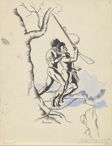 Curator: Let's discuss this ink drawing, attributed to F. Ockerse, entitled "Nieuw-Guineese jager daalt af van een gevlochten ladder," or "New Guinean Hunter Descending a Woven Ladder." It's believed to predate 1936. Editor: My initial impression is that the artist created this image from an outsider's perspective, romanticizing a foreign encounter through the graphic weight of the pen strokes that add to its energy. Curator: Absolutely, let’s delve deeper into that perspective. Given the historical context, pre-1936, we're looking at a colonial lens shaping this representation of Papua New Guineans. The very act of depicting this "hunter" speaks volumes about the power dynamics at play. Editor: Yes, consider the ladder, a tool of access and control. The means by which that ladder was manufactured is central. Was it local material? By whose labor? Curator: The ladder as material, symbolic, and functional is an incisive observation. It visually emphasizes a vertical hierarchy, the descending hunter moving from some unspecified “up” to meet the assumed viewers and figures at the bottom. And why is the hunter wielding a knife? It feels almost staged for the colonial gaze. Editor: Exactly. The figures below, especially the one in Western dress, bear a rifle—instrument of mass production and the raw materials behind it, steel, wood, labor to consider too. The materials and production tell as much as any surface read. Curator: The composition really sets the scene: a figure exiting from this strange hybrid ladder to… well, to what? What is to be extracted? Are they here simply for observation, a moment of so-called ethnographic curiosity, or something far more sinister? Editor: Good point. It could be an object of trade, resource extraction, cultural appropriation; but at its most basic, the materials speak of colonial encounter and ensuing shifts in the labor dynamics of everyday life. The ladder can also signal change, imposed industrial process that alters life’s course. Curator: A very important thought, and I would even like to include what this signals for the contemporary experience, the impact of globalization, appropriation and historical legacy. Thank you. Editor: Absolutely, understanding production means and the weight that materiality carries can teach us a lot about this seemingly quaint picture.